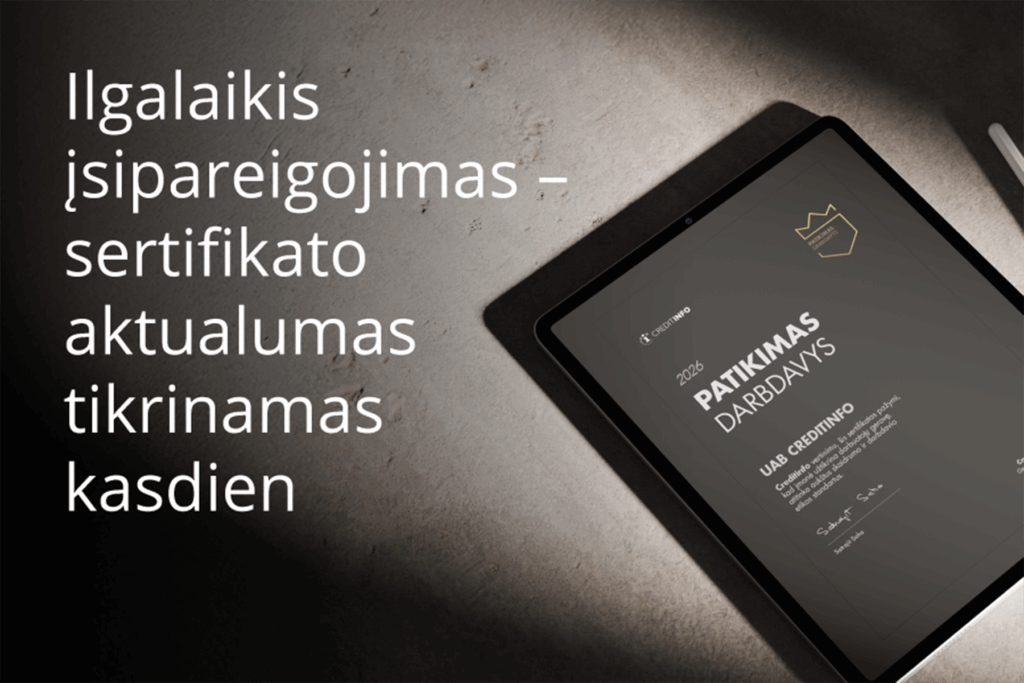 - Jūsų įmonė „Patikimas Darbdavys 2026” sąrašuose. Pateksite į „Patikimo darbdavio” sertifikatu sertifikuotų įmonių sąrašą, skelbiamą creditinfo.lt bei rekvizitai.lt svetainėse.